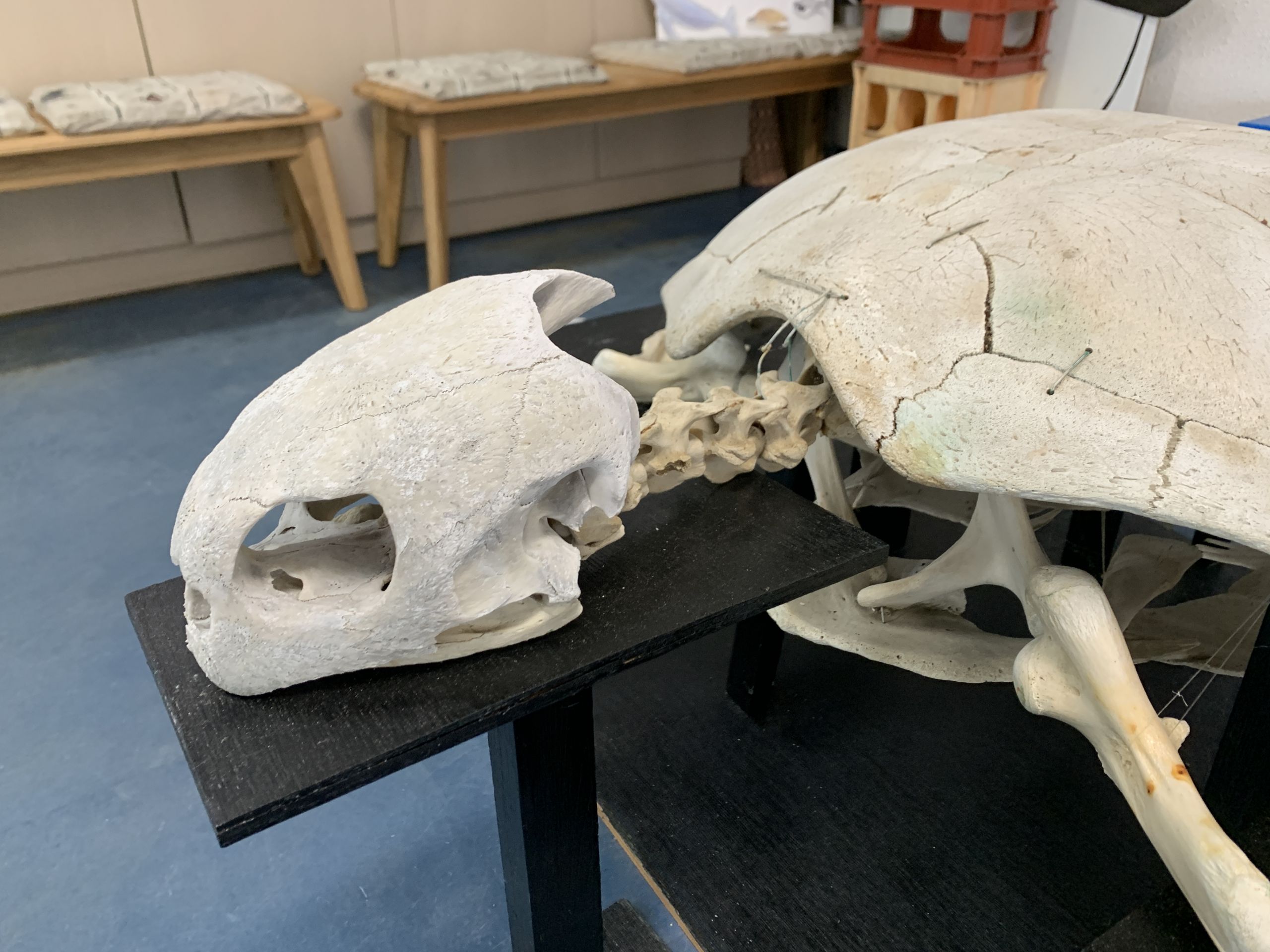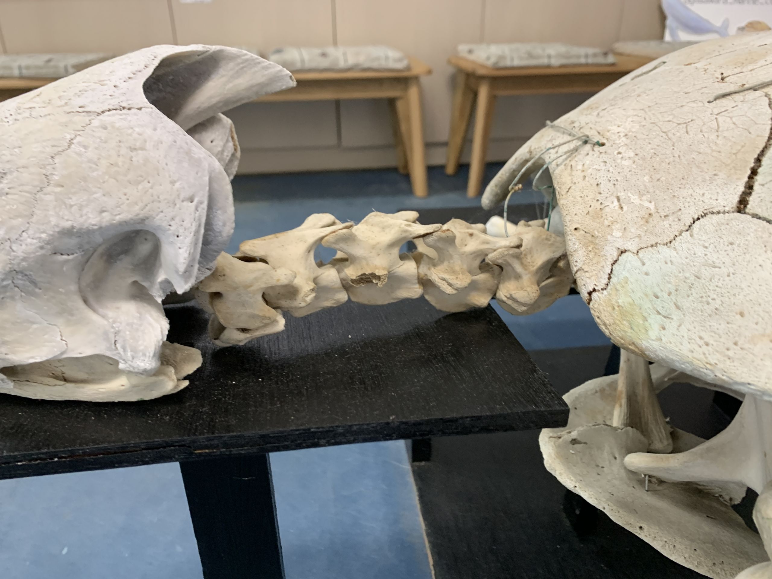 ちなみにウミガメは頸椎が8個あり、人間と比べると1つ多いです。右の写真では5つ見えているので、残り3つは甲羅の中にフィットしています。